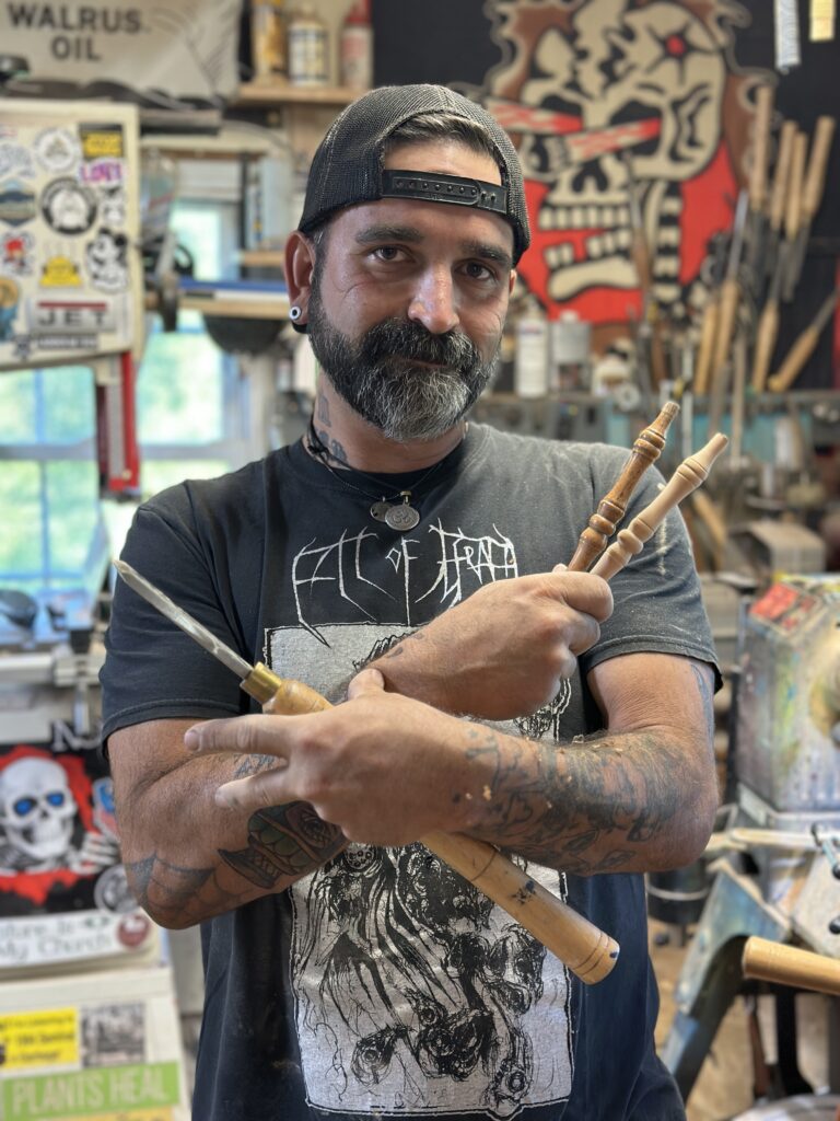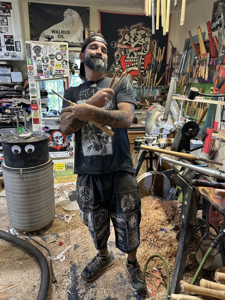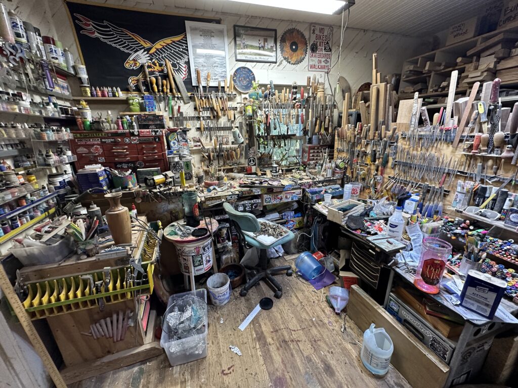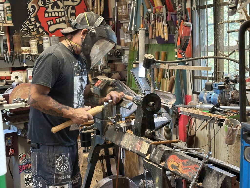 Finally, there was a lull in the grinding noise, and I heard a “Hey!” Jason emerged in his oversized cargo shorts, rocker T-shirt, and backwards baseball cap. His face and short black-and-white beard were covered in wood dust and sweat. Alone in this shack with a strange man, I might have felt uneasy, but his disarming smile and friendly demeanor immediately put me at ease. He looked every bit the part of a free-spirited hippie skater punk, yet also a distinguished artist—and just a genuinely nice guy.