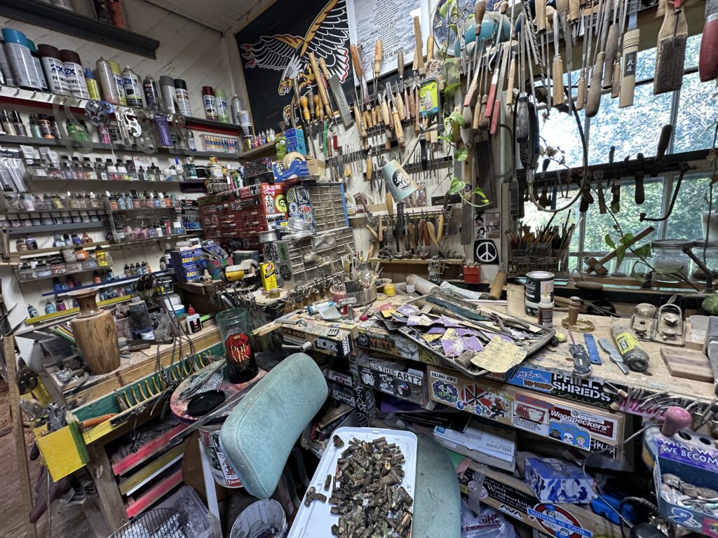 I cautiously entered the rustic shack and called out, “Hello,” several times, to no avail. I made my way through a maze of small rooms, following the music and the buzz of machinery. The studio was an incredible display of colors and woodworking tools of every size and shape, all covered in a fine coat of wood dust. In every nook there were shelves lined with paints and parts, and every surface was decorated with posters and stickers, with the occasional skateboard leaning against a wall. It was, in every sense, a beautiful chaos—an art installation in itself.