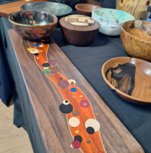 He explained that the pucks came from branches—but not just any branches. He had hand-picked the most aesthetic limbs, baked out the moisture in a kiln, soaked the pieces in a hardening solution, then dried them again. This process prevents rot, eliminates bugs, strengthens the fibers, and seals the wood from moisture. After that, he shaved off the bark and edges to create smooth disks and dyed them with various color stains. Even as a work in progress, the piece was stunning.